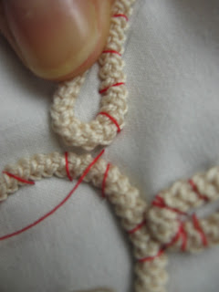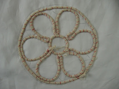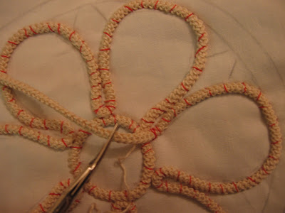 Dopo che abbiamo preparato un po' di centimetri di cordoncino, nelle foto che seguono potete notare come imbastirlo sul modello. E' bene che usate per imbastire un filo di colore, (ma che non sbiadisce) così che vi sarà più facile quando taglierete i fili, (a lavoro ultimato) staccare il lavoro finito dal modello. Cercate di lasciare il cordoncino piuttosto morbido, senza tirarlo, facendo particolare attenzione nelle rotondità. Quando finiamo di montarlo lo taglieremo lasciando circa 3cm al margine, che scuciremo quel tanto che basta per congiungerlo al resto del modello.