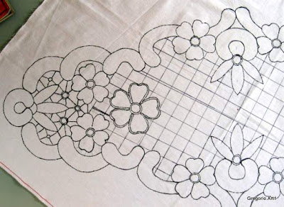 Se non avete un modello già pronto, lo potete ricavare voi! Aiutandovi con la carta da taglio (quella con cui si fanno i cartamodelli, per intenderci), potete copiare il modello. Dopodiché, con la carta fotocopiativa (carta carbone) potete copiarlo al centro di un pezzo di tela, facendo si che restino circa 25 cm. di margine oltre il disegno. Il modello usato da me misura 12 cm. di diametro.